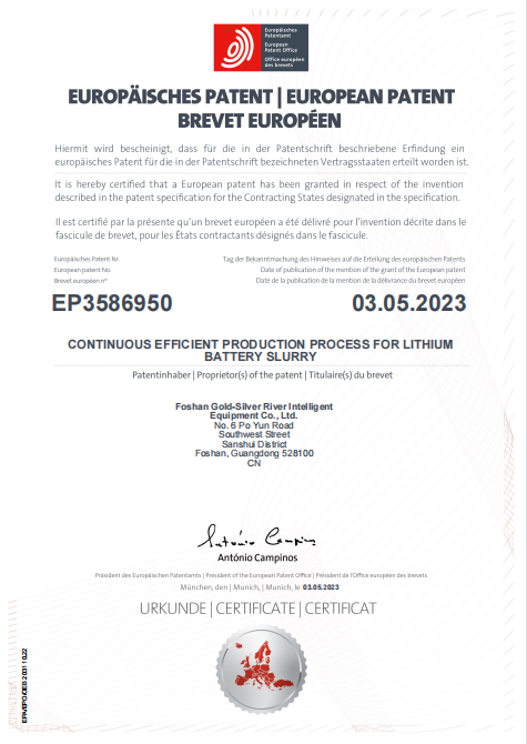 近期,由佛山市蝌蚪蜗精品视频在线观看智能装备股份有限公司申请的发明专利——一种锂电池浆料连续化高效生产工艺,正式获得由欧洲专利局(EPO)颁发的专利证书(专利号:EP3586950)。