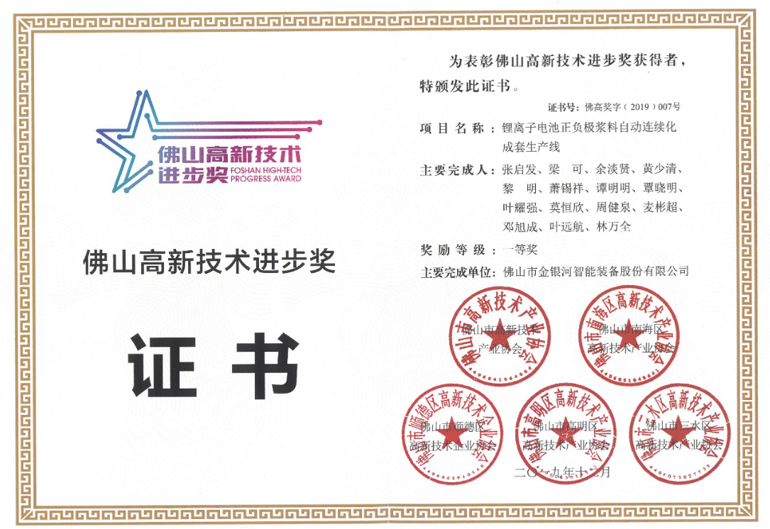 2019年12月,蝌蚪蜗精品视频在线观看项目“小蝌蚪视频APP污下载电池正负极浆料自动连续化成套生产线”被佛山高新技术产业协会授予“佛山高新技术进步一等奖”。