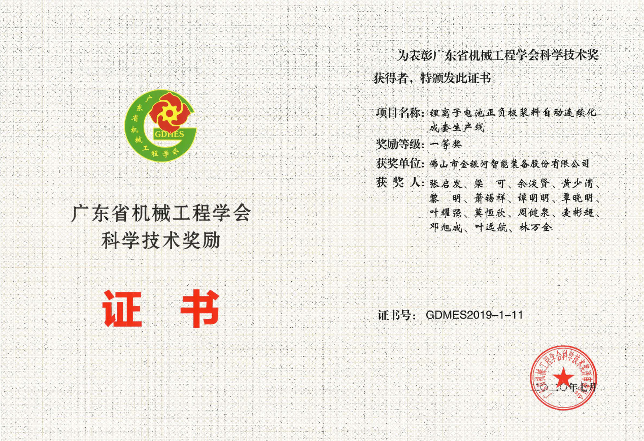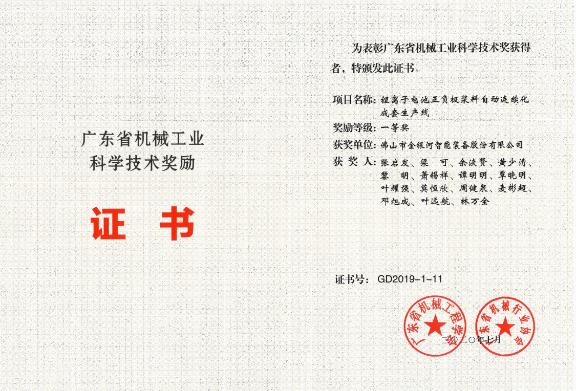 2020年7月,蝌蚪蜗精品视频在线观看项目“小蝌蚪视频APP污下载电池正负极浆料自动连续化成套生产线”被广东省机械工程学会、广东省机械行业协会授予“广东省机械工业科学技术一等奖”。 该项目开创了连续化大批量生产锂电池浆料的成套技术、工艺和装备,经科技成果鉴定,该项目总体技术水平处于国际先进水平,部分技术达到国际领先水平。本次获奖是对蝌蚪蜗精品视频在线观看自主创新技术的高度认可和极大鼓舞,蝌蚪蜗精品视频在线观看将持续不断提高自主创新能力,提供优质领先产品,致力提高客户服务水平、推动所从事行业的持续升级!