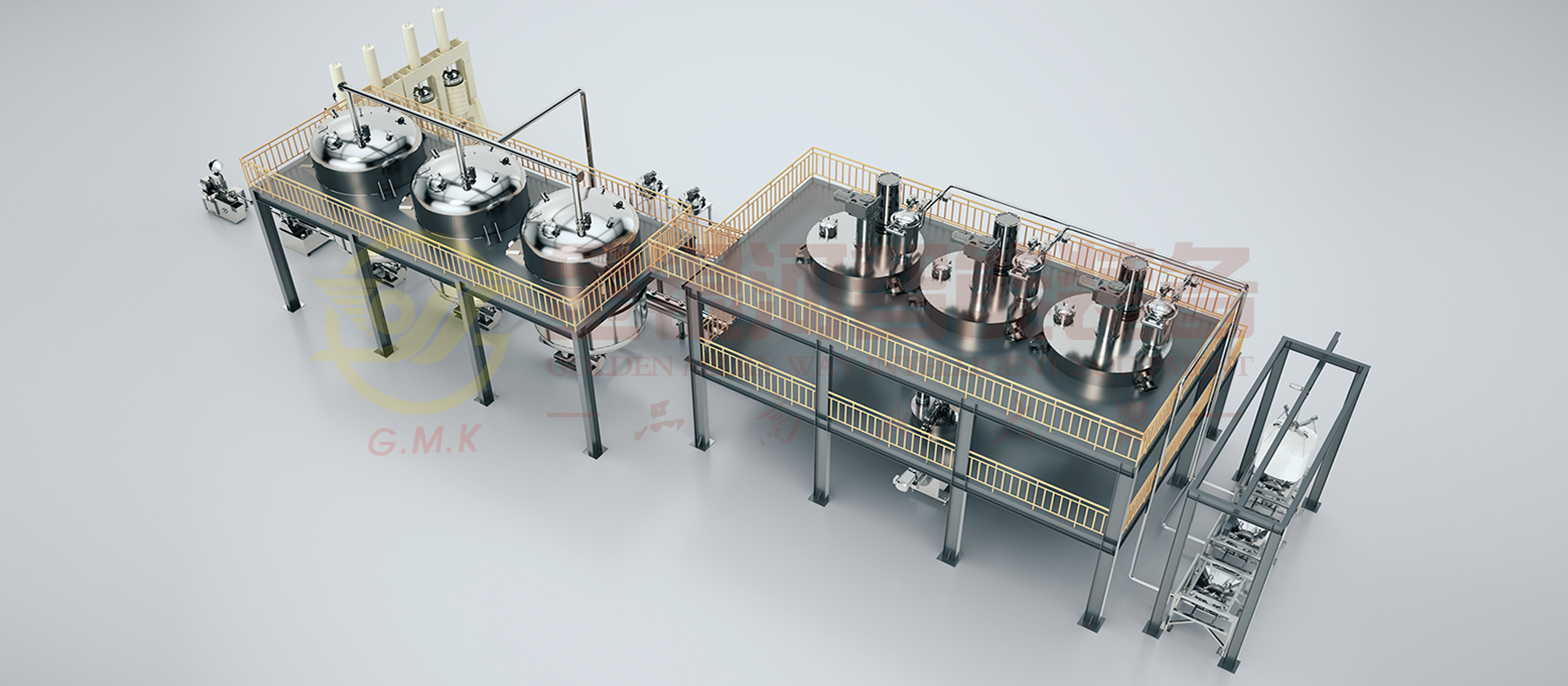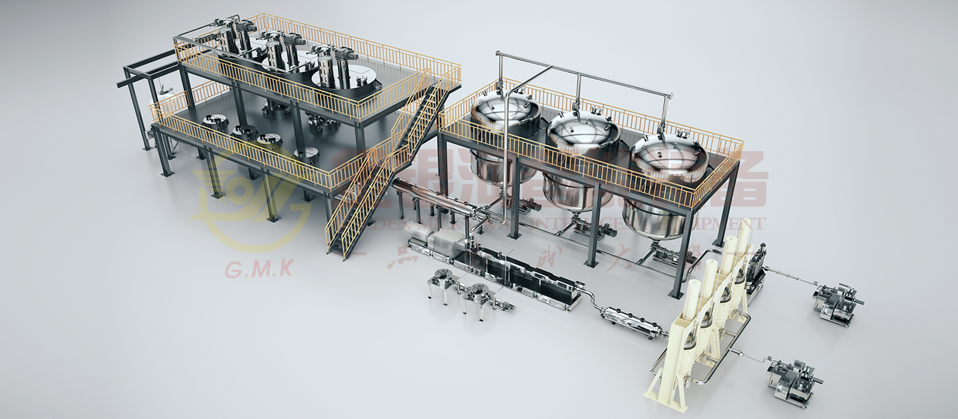 由计量斗、称量及输送系统、贮罐、冷却器、多工位出料机、喂料机、高速预混机、双螺杆螺旋混合机、辅助设备及DCS中央控制系统组成。原材料(粉体与液体)通过精确的计量系统在线自动和连续输送到螺旋混合机中,利用螺旋混合机中的混合、分散、研磨、温控、抽真空等功能满足不同的生产配方工艺,对于建筑胶产品如:脱肟、脱醇型密封胶根据工艺需求作出多种设备调整组合,通过在线加入色浆及助剂至其中。它的生产效率高,适合大规模生产;它具有自动化程度高,杜绝物料直接接触空气,产品质量稳定性好,物料及能源损耗少等优点。