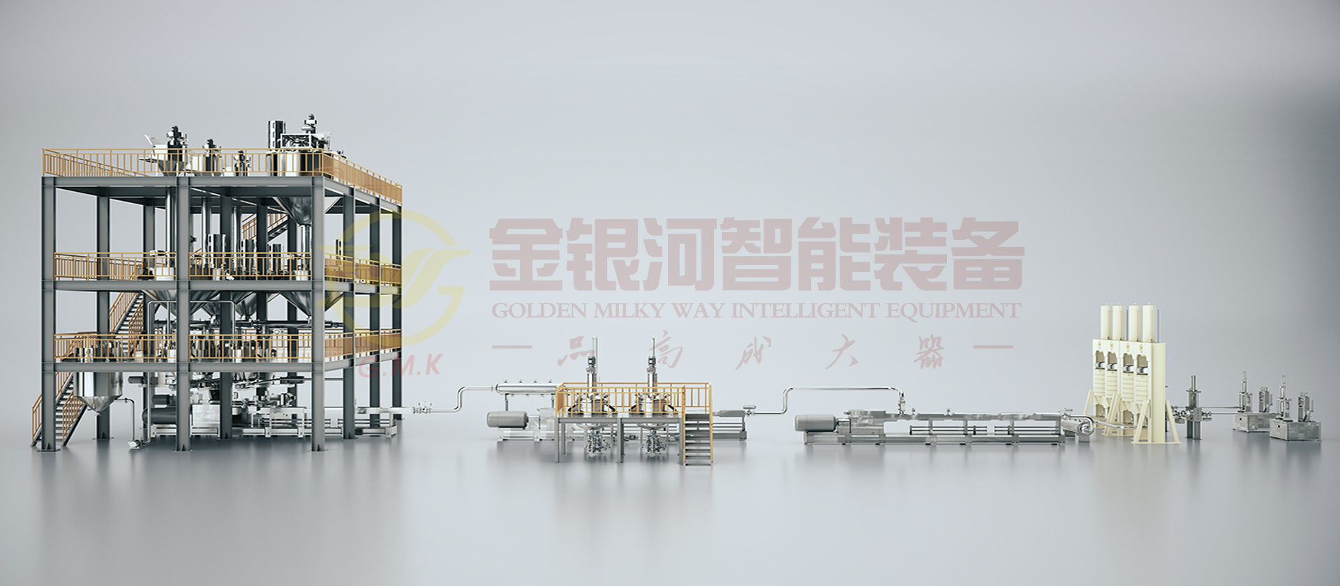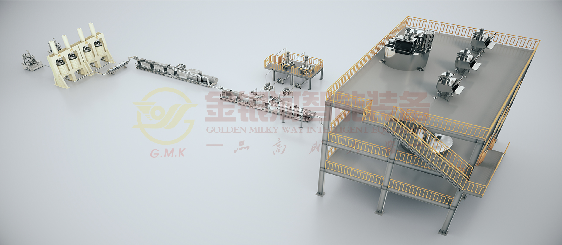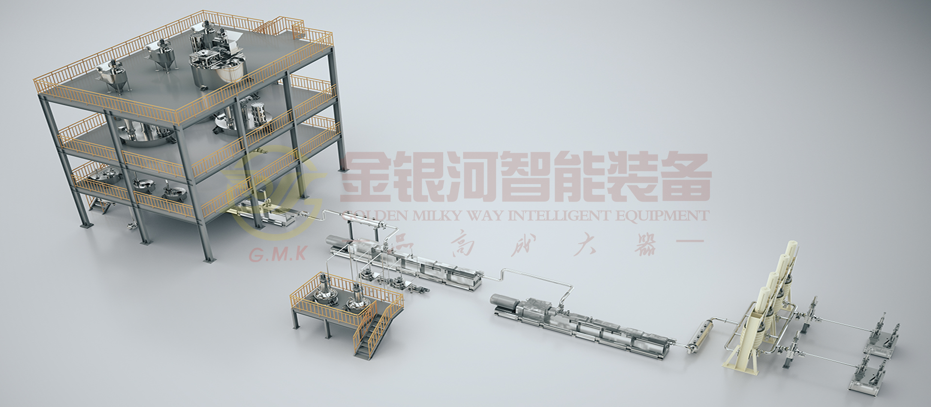由计量斗、称量及输送系统、贮罐、冷却器、多工位出料机、喂料机、网式过滤器、双螺杆螺旋混合机、辅助设备及DCS中央控制系统组成。原材料(粉体与液体)通过精确的计量系统在线自动和连续输送到一阶螺旋混合机中,在一阶螺旋混合机中完成混合、分散、研磨、抽真空等产出基料后进入二阶螺旋混合机再到三阶螺旋混合机,中途克服解决了物料的物料粘度高峰,通过在线助剂至其中,完成混合、分散、抽真空等完成品料制作并输出进入多工位出料机暂存,多工位机出料机轮流交替出料过滤包装。它的生产效率高,适合大规模生产;它具有自动化程度高,杜绝物料直接接触空气,产品质量稳定性好,物料及能源损耗少等优点。