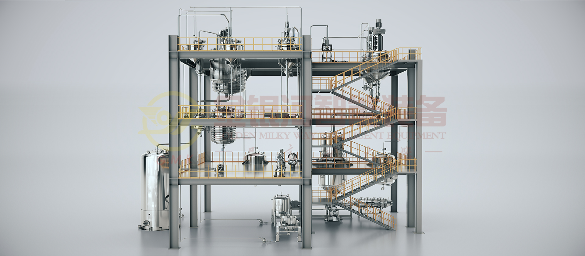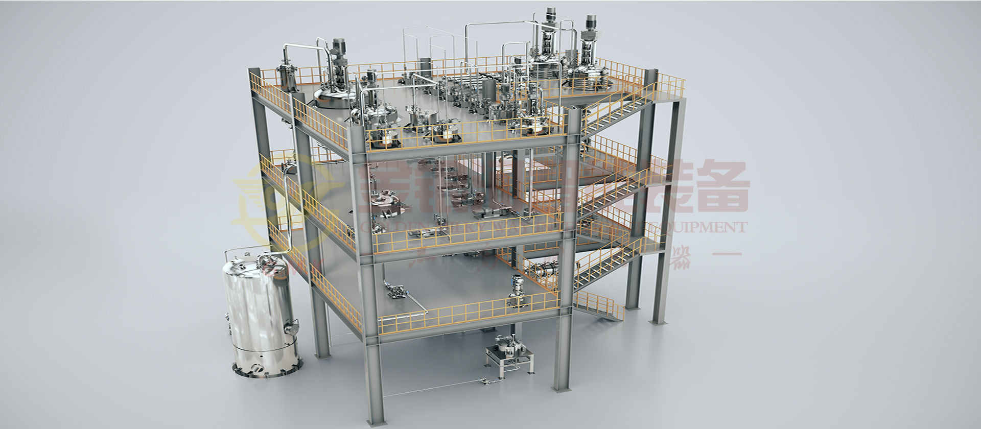 由计量斗、称量及输送系统、贮罐、加热器、冷却器、在线混合单螺杆、聚合反应釜、脱低分子器、单螺杆出胶机、辅助设备及DCS中央控制系统组成。生胶的原材料(液体)通过精确的计量系统在线自动和连续加入至混合单螺杆中,前期可先通过加热器预热已脱水的DMC,缩短液体料在混合单螺杆中的反应时间后进入混合单螺杆机中,并同时在线加入碱胶、乙烯基硅油、封头油等液体料,通过加热升温,使其在混合单螺杆机中完成聚合反应后进入聚合釜内(多台釜轮流切换使用,达到不停机效果),后送料至脱低分子器加热升温,抽真空脱低得到产品,并通过单螺杆出胶机把产品推送到冷却器冷却出料包装,单螺杆出胶机可实现同时抽真空同时出料的功能,真正做到连续自动化。它的生产效率高,适合大规模生产;它具有自动化程度高,杜绝物料直接接触空气,产品质量稳定性好,物料及能源损耗少等优点。